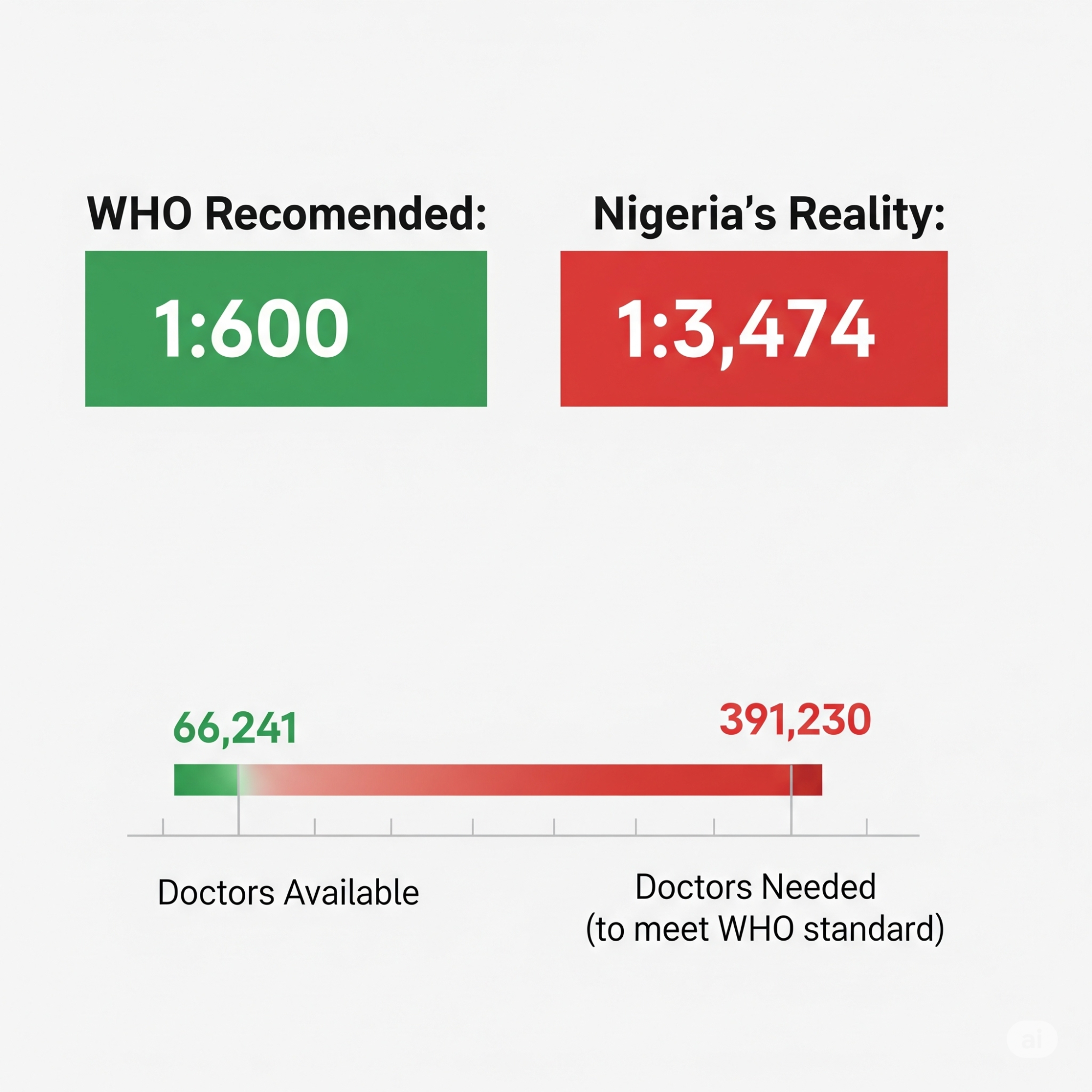 According to Nigeria's "State of Health of the Nation Report 2024," the current ratio is approximately 1 doctor for every 3,474 people, or 2.9 doctors per 10,000 people. This is a significant shortfall, requiring approximately 391,230 doctors to meet the WHO standard, while the country currently has around 66,241 licensed medical professionals. This leads to long patient wait times. It compromises the quality of care you receive.