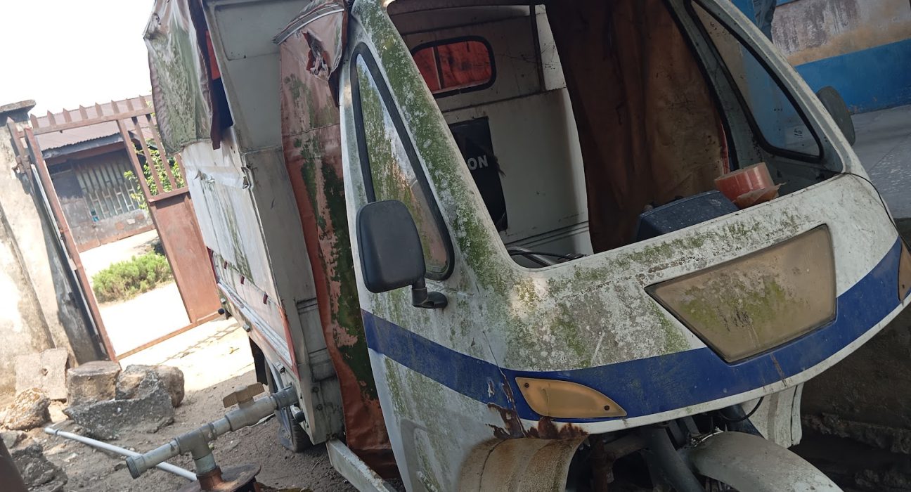 A dilapidated ambulance with flat tires and peeling paint, abandoned outside a Primary Health Centre in Sokoto state (credit: Frontline Investigative Journalism Program phase 1)